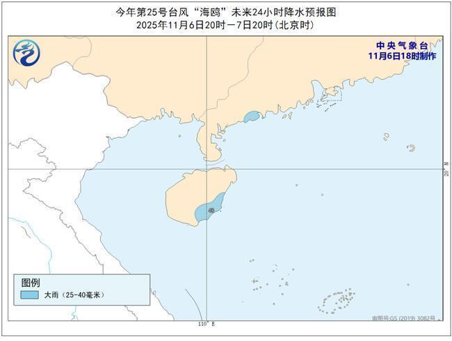 降水预报:6日20时至7日20时,海南岛东南部的部分地区和广东西部沿海局地将有大雨(25-40毫米)。