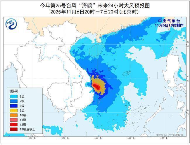 大风预报:6日20时至7日20时,受“海鸥”和南下冷空气的共同影响,台湾海峡、巴士海峡、南海大部及东沙群岛、中沙群岛、西沙群岛、南沙群岛西部、琼州海峡、北部湾将有6-8级大风、阵风9-10级,其中南海西部的部分海域将有9-11级大风、阵风12-13级,“海鸥”中心经过的附近海域或地区风力有12-14级、阵风15-16级。