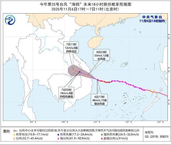 今年第25号台风“海鸥”已于今天(6日)下午由超强台风级减弱为强台风级,下午5点钟其中心位于越南嘉莱省归仁市东偏南方向大约95公里的南海西南部海面,就是北纬13.5度、东经110.1度,中心附近最大风力有15级(48米/秒),中心最低气压为945百帕,七级风圈半径180-250公里,十级风圈半径80-120公里,十二级风圈半径30-50公里。